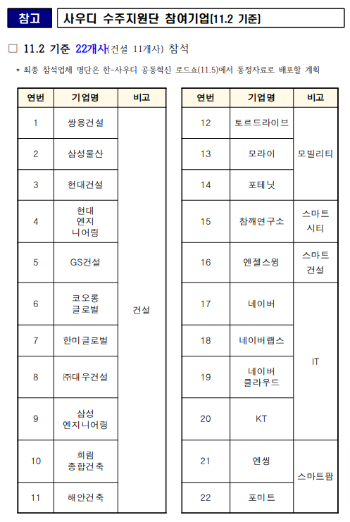 국토교통부 보도자료를 참고해보면 22개의 사우디 수주지원단 참여기업 중 '건설사가 무려 11개'사가 참여했습니다.